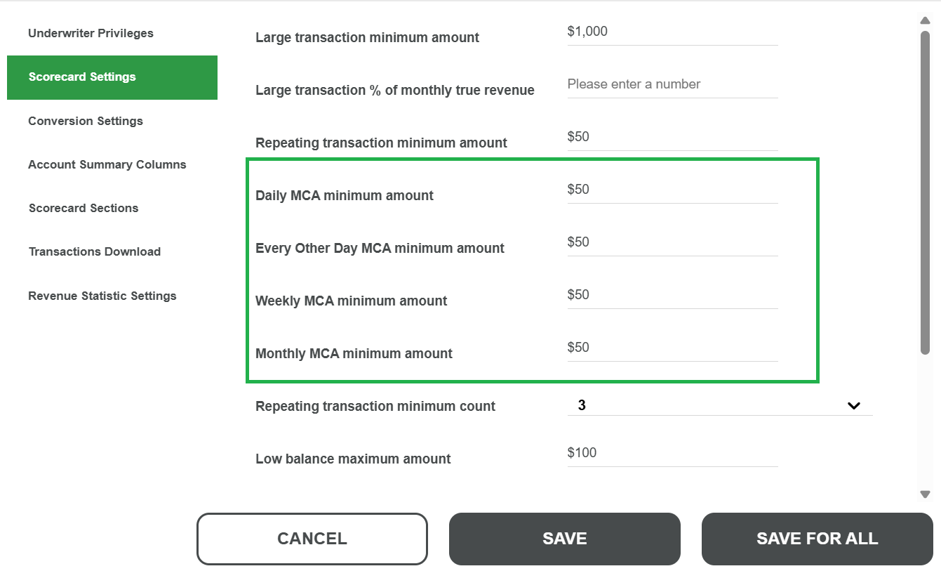 You can now set minimum withdrawal amounts by frequency. This determines when repeating transactions, specifically for companies offering MCA and other financial services, are classified as MCA positions.