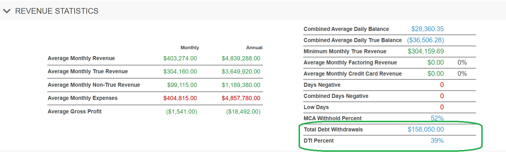 - DTI Percent: Shows the percentage of Total Debt Withdrawals from Average Monthly Revenue.